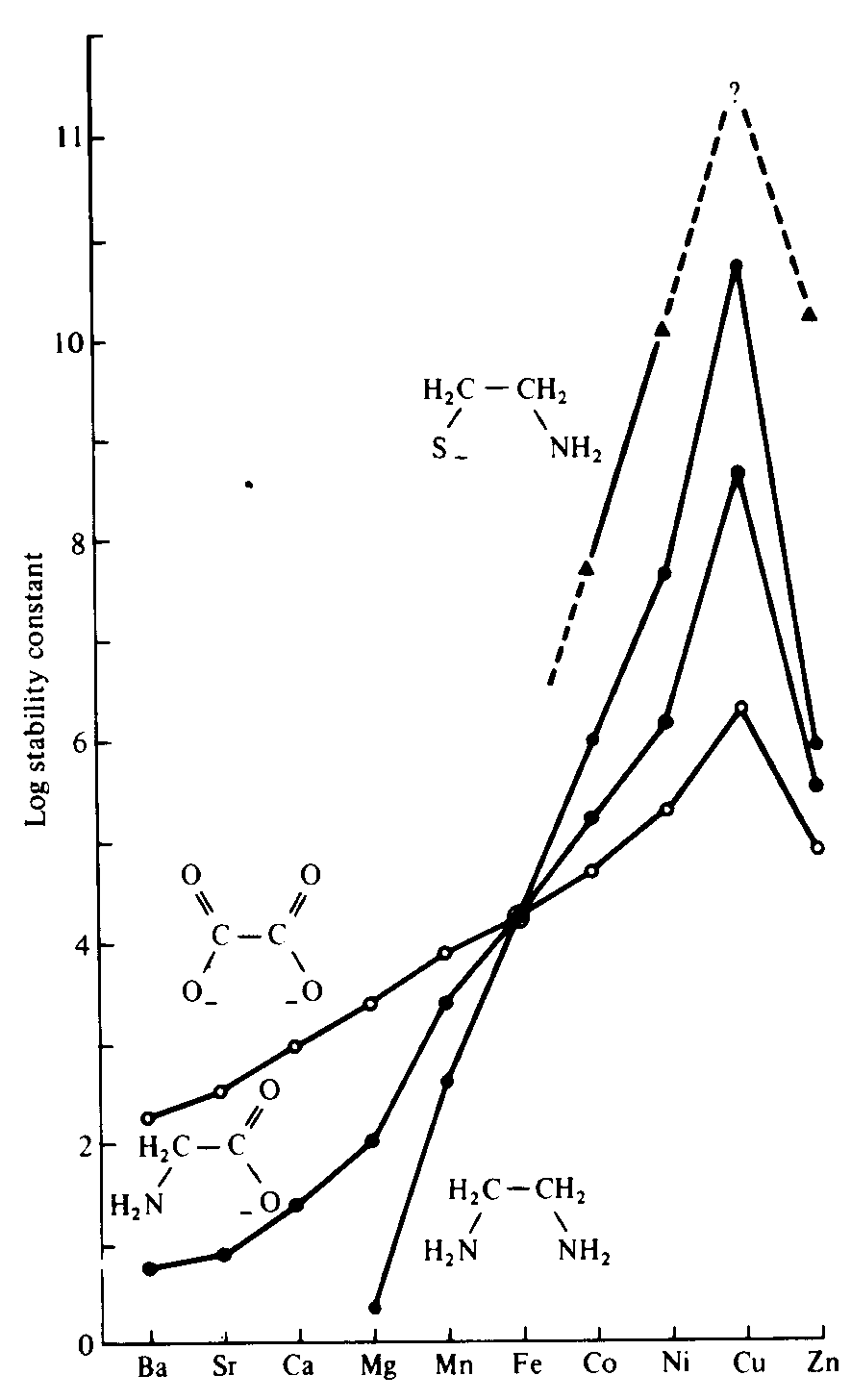 pKm = log [CH3HgB] / [CH3Hg+] [B] ; (b) pKd = log [HB] / [H+] [B]A importância da acidez inerente e de um segundo fator duro - mole está bem mostrada na série de Irving - Williams e em alguns quelatos com oxigênio, nitrogênio e enxofre (Fig. 5). A série de Irving-Williams de estabilidade crescente do Ba2+ ao Cu2+ é uma medida de acidez inerente crescente do metal (em grande parte devido ao tamanho decrescente). Sobrepondo-se a isto há o fator dureza-moleza segundo o qual espécies mais moles, que vêm no final da série, (quanto maior o número de elétrons d) favorecem ligantes S > N > O. Quanto mais duro os íons de metais de transição iniciais e os alcalino terrosos (poucos ou nenhum elétron d) se ligam preferencialmente na ordem O > N > S.
